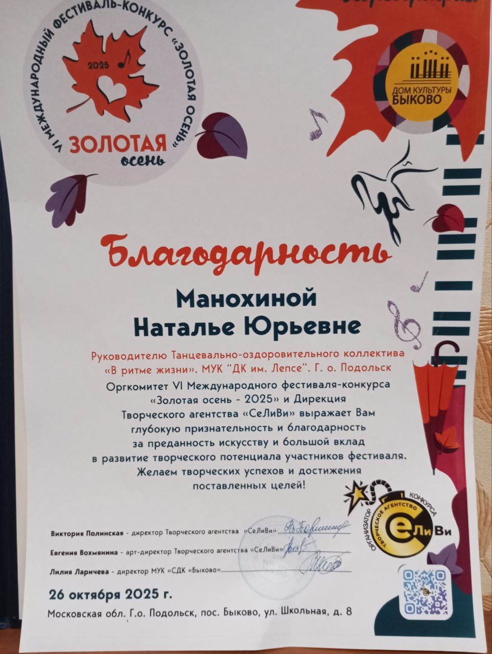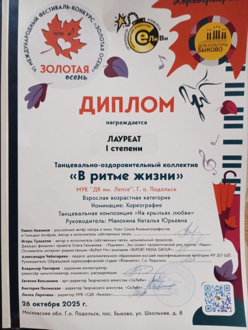 26 октября 2025 года Танцевально-оздоровительный коллектив «В ритме жизни» под руководством Натальи Юрьевны Манохиной принял участие в VI Международном фестивале-конкурсе «Золотая осень — 2025», где был удостоен высшей награды — звания ЛаУРЕАТ I СТЕПЕНИ.Коллектив был награжден за танцевальную композицию «На крыльях любви» в номинации «Хореография» (взрослая возрастная категория).Кроме того, руководитель коллектива Наталья Юрьевна была отмечена Благодарностью за преданность искусству и большой вклад в развитие творческого потенциала участников.Поздравляем коллектив и его руководителя с блестящим успехом!